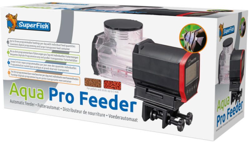 A SuperFish Pro Aqua Feeder egy prémium minőségű digitális automata haletető, amelyet kifejezetten halbarátoknak terveztek, akik maximális kontrollt szeretnének az etetési időpontok és mennyiségek felett. A készülék lehetőséget ad napi akár három programozott etetés beállítására, külön-külön adagolási mennyiségekkel, így teljes mértékben az akvárium lakóinak igényeihez igazítható. A nagy, átlátszó etetőtartály akár pellet, pehely vagy rudacska formájú haleledeleket is képes befogadni (3 mm-ig). A digitális kijelzőn keresztül könnyen kezelhető, intuitív programozással rendelkezik. Különösen hasznos nagyobb akváriumokhoz, ahol fontos a pontos és rendszeres etetés. A rögzítés biztonságos és stabil, a mellékelt tartókonzol segítségével egyszerűen felszerelhető. Főbb jellemzők: